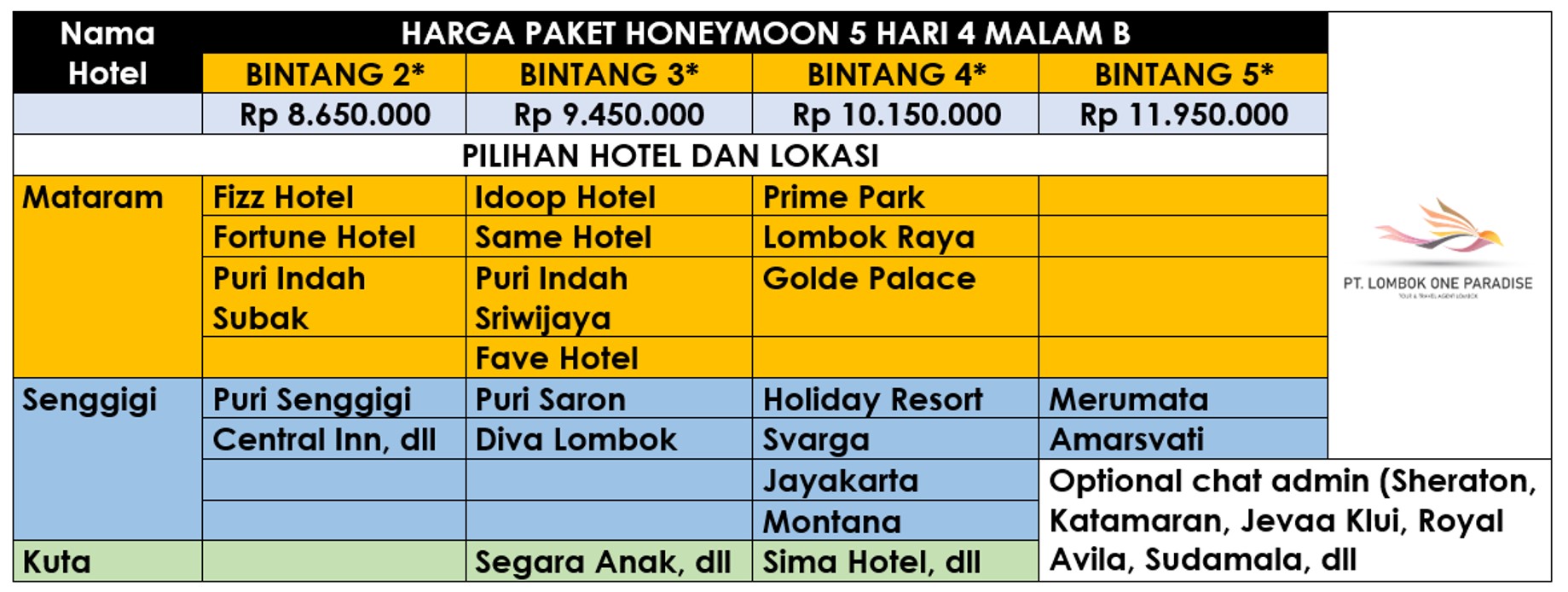 Daftar Harga Honeymoon Lombok 5H4M Terhitung Per Couple Paket B