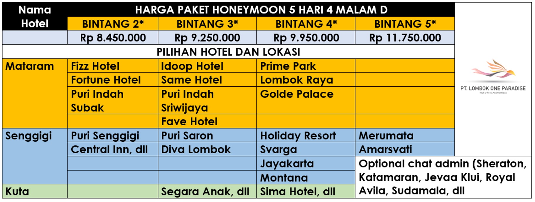 Daftar Harga Honeymoon Lombok 5H4M Terhitung Per Couple Paket D