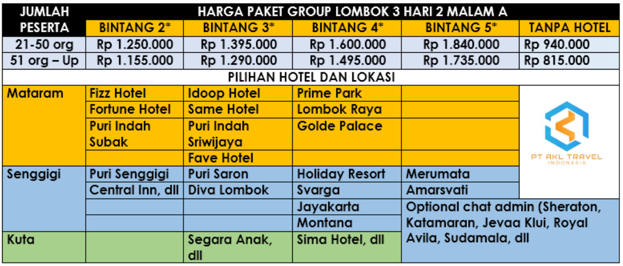 Detail Harga Paket Group Lombok 3 Hari 2 Malam (Paket A) Ini Sesuai Dengan Jumlah Peserta dan Hotel Pilihan Anda