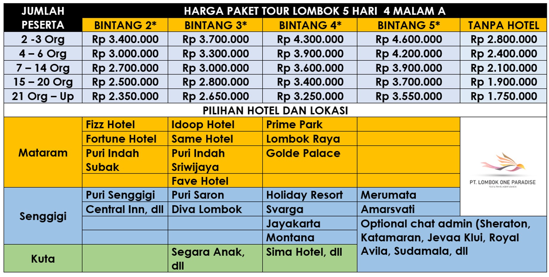 Detail Harga Paket Tour Lombok 5 Hari 4 Malam ( Paket A )