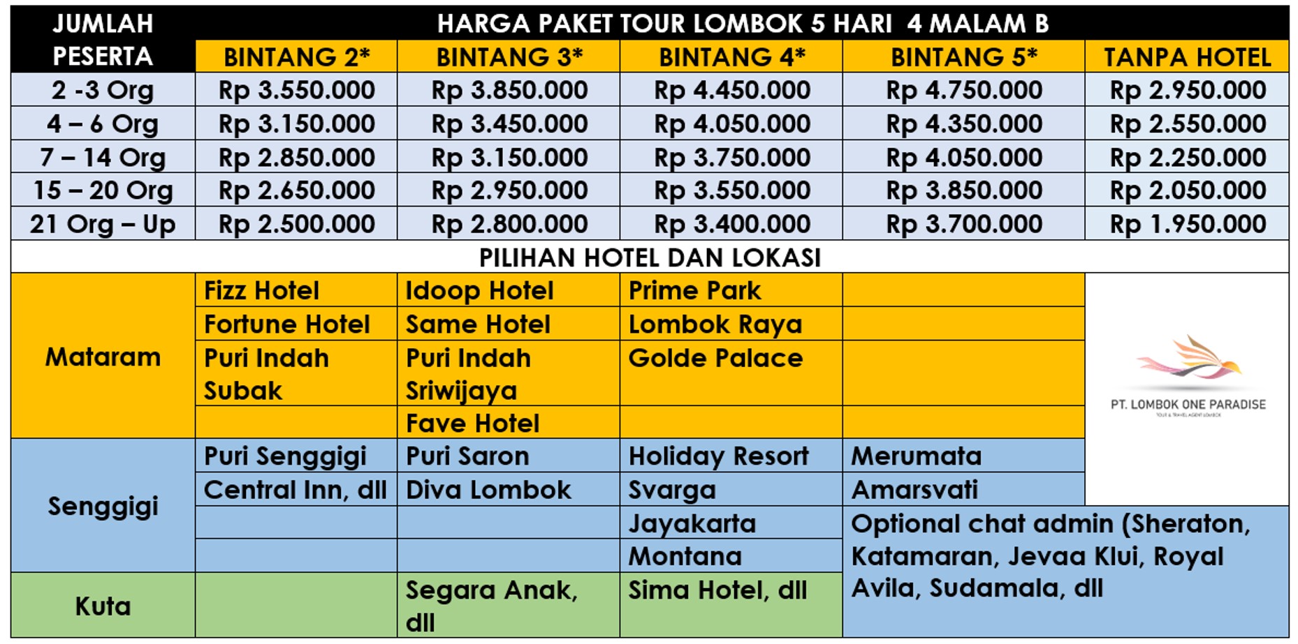 Detail Harga Paket Tour Lombok 5 Hari 4 Malam (Paket B)